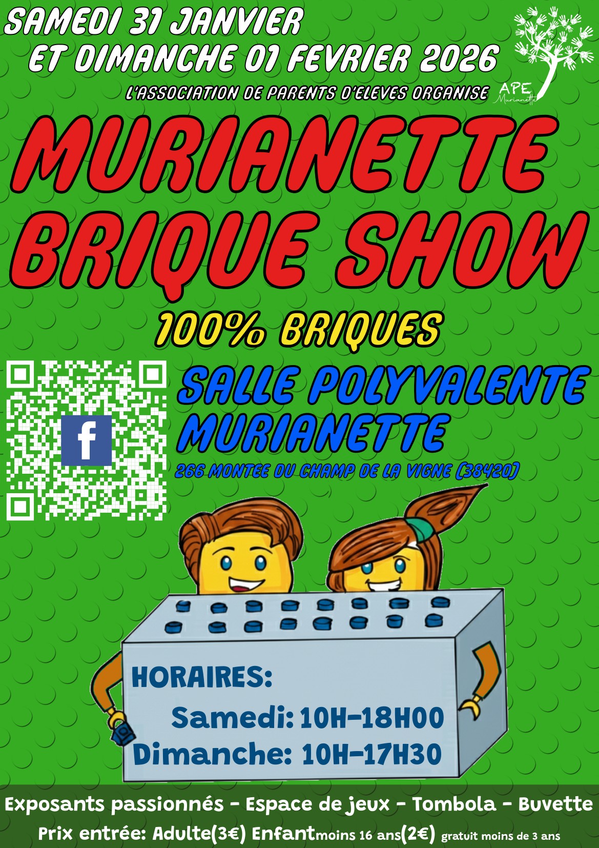 L’APE vous propose une exposition légo “Murianette Brique Show” le week-end du samedi 31 janvier au dimanche 1er février 2026 dans la salle polyvalente.
