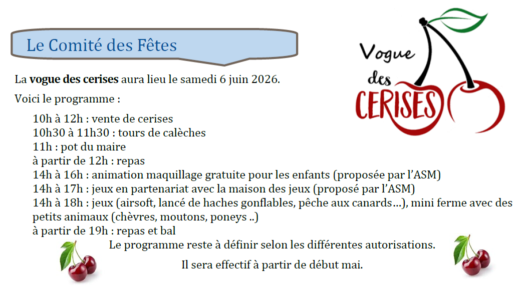 La vogue des cerises aura lieu cette année le samedi 6 juin 2026 dans la cour de la mairie à partir de 10h.