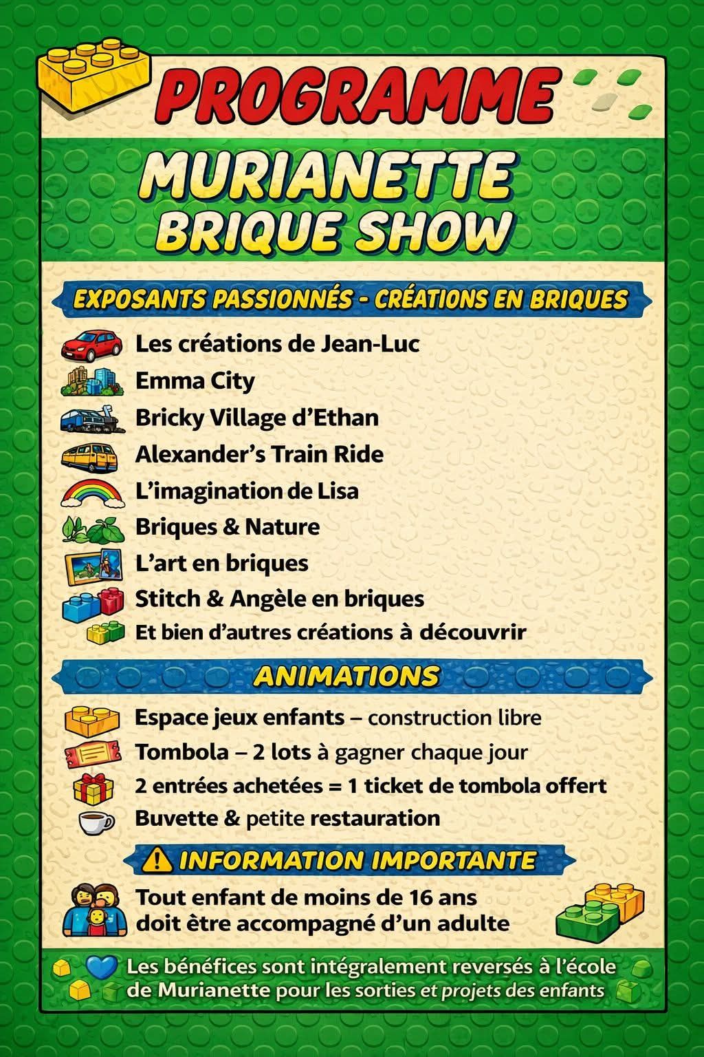 L’APE vous propose une exposition légo “Murianette Brique Show” le week-end du samedi 31 janvier au dimanche 1er février 2026 dans la salle polyvalente.