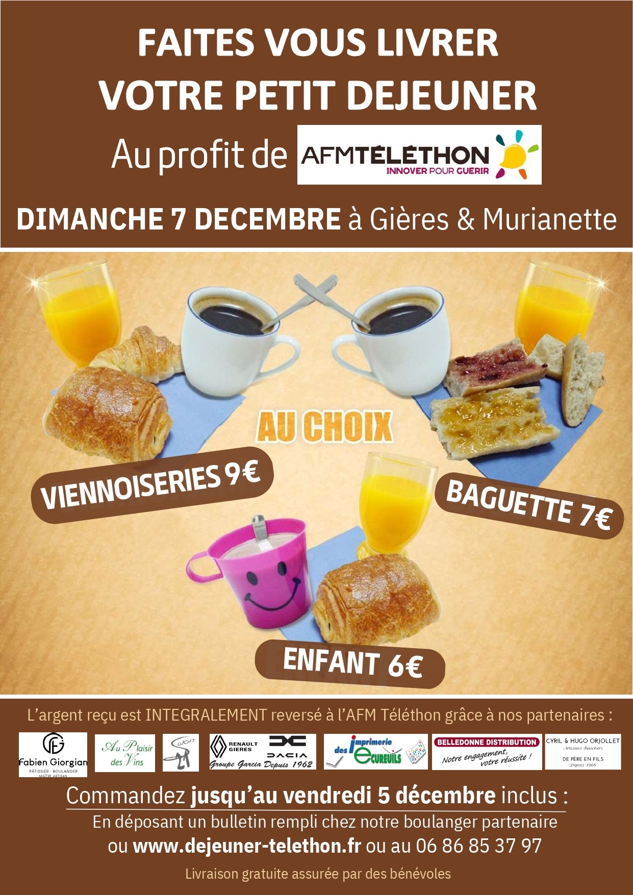 Régalez-vous tout en faisant une bonne action ! Réservez votre petit-déjeuner sur www.dejeuner-telethon.fr ou en déposant un bulletin chez vos boulangers gièrois partenaires.